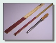 The shaping tools. The narrow strip sanding stick is the same dimensions as the actual strips but without milled edges, with 60 grit sandpaper glued on both sides. The tool is long enough to span between the stem and the first form, as seen below. The wide sanding stick is the same, but wider. This one is used to establish the initial shaping, where the first strip is fastened. The narrow one could also be used here. Both of these sanding sticks are useful elsewhere on the boat, being used similar to a rasp or file. The steel piece is a large round microplane, extremely handy for initially hogging off wood prior to final shaping with the sanding strips. It works better than a flat version.