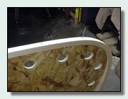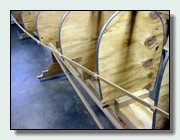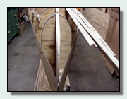 If you have the stems clamped to the form, try removing the clamps and drilling holes straight through the stems inside the 1/8" lines, about 8 inches apart, over the entire stem. Drill them square to the tangent of the curve. The drill bit size should be slightly less than the diameter of 2" finishing nails. Now nail the stem to the form, leaving the heads of the nails protruding slightly. This gets the clamps out of the way, while holding the stem securely on the form. Just don't forget to remove the nails as you strip up to them if you plan to use a narrow external stem and glue the ends of the strips together. You can see this later in some of the pictures. The nail holes can be plugged and filled after the completed hull is righted.