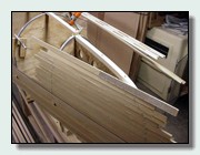 The first strip in place. For this boat, I placed the strip at the sheer at the center form, and fastened it level all the way to the stem. This will require fill strips below it.